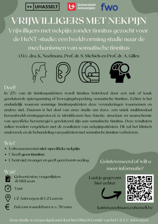 - Eénmalige gehoortest, vragenlijsten en een onderzoek om na te gaan of uw geluidsperceptie verandert bij de uitvoering van bepaalde nekbewegingen (UZA, 45 min)