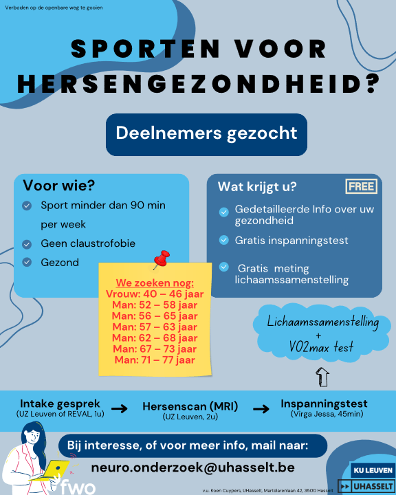 - Eénmalige magnetische resonantie (MRI) scans van de hersenen (UZ Leuven, 2u30)